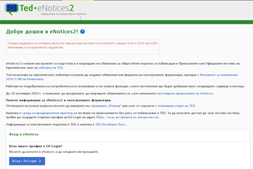 Службата за публикации към Официалния вестник на Европейския съюз (ОВЕС) съобщава, че на 5 септември, в периода от 8 до 11:30 ч. са възможни прекъсвания и технически проблеми при използването на системата eNotices2, свързана с публикациите в Tenders Electronic Daily (TED) – ОВЕС.