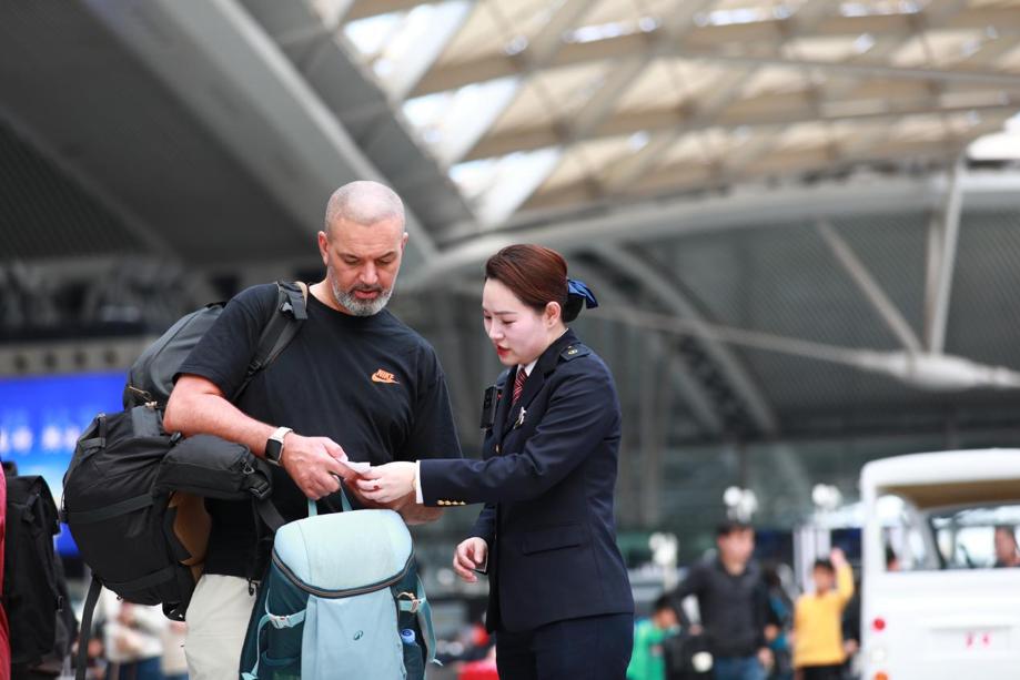 Chen Xuan помага на чуждестранни пътници на южната жп гара Гуанджоу по време на натовареното пътуване по време на Пролетния фестивал. Владеейки четири езика, тя помогна на повече от 300 задгранични пътници през първите пет дни от пиковия период. [Photo provided to chinadaily.com.cn.]
