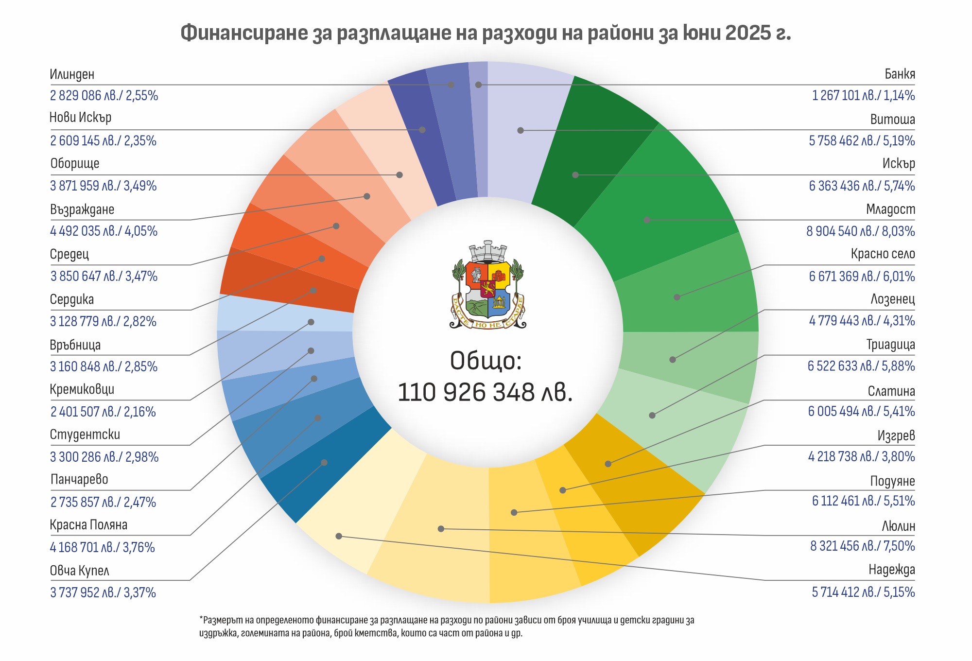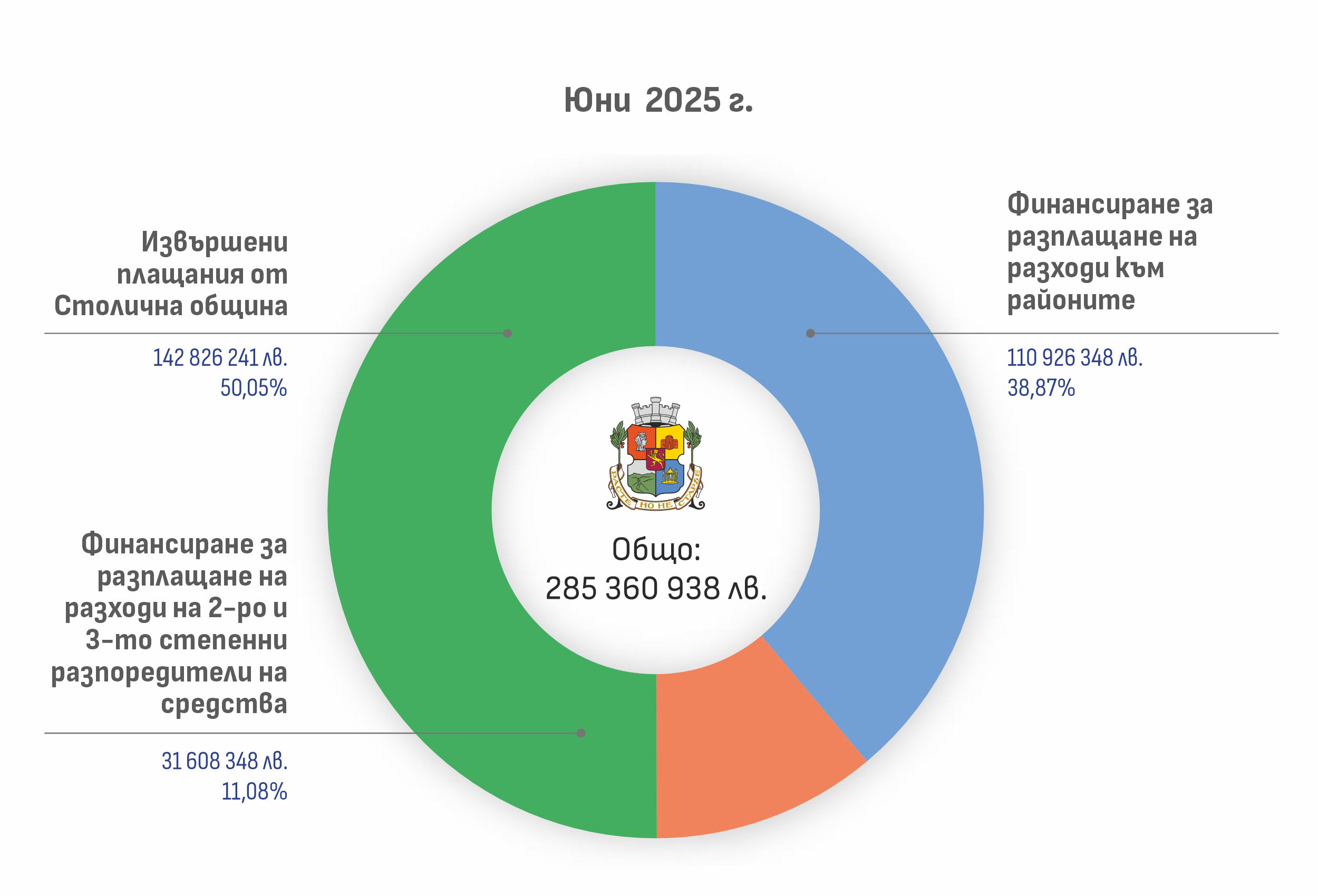Общо разплатени от Столичната община средства през юни са – 285 360 938 лв. От тях извършените плащания директно от общината са в размер на 142 826 241 лв., което е 50.05% от общите разплащания за месеца.